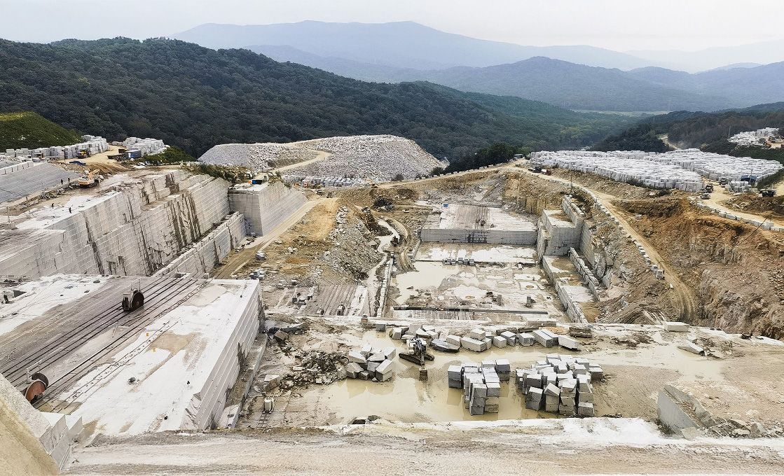 吉林白の大きな特徴は、採掘と供給の安定性。採掘許可は2035年までと長期にわたり、さらに丁場(採石場)のピットが大きいため、大きなサイズのブロックも確保できます。そのため外柵用の大型材から墓石まで、幅広い製品加工に対応可能です。